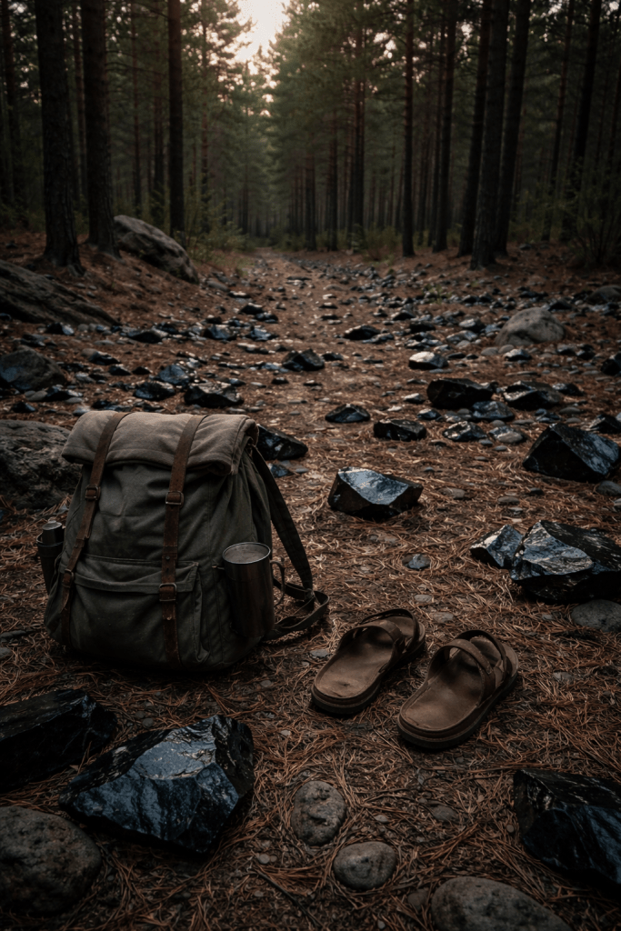 The climb steepened, and I began reciting the Rosary with each step. The dirt road narrowed through a forest thick with pine needles. Something caught the light off the trail. I stepped aside and found large, glossy slabs of black obsidian scattered across the ground—lava cooled and broken into blades. Some pieces stretched five or ten inches, their edges sharp enough to cut hide. Hundreds lay untouched. I wondered why no one had gathered them for souvenirs or jewelry, not yet knowing this forest was a protected park.
