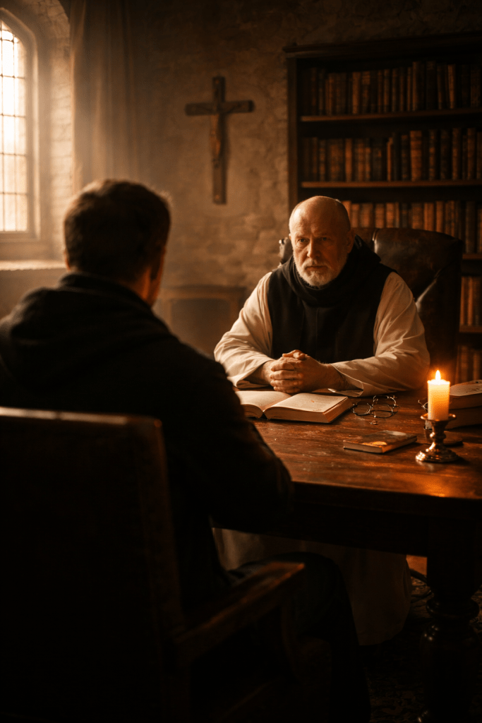 The Abbot sat across from me, hands folded, his inquisitive eyes fixed on me. The silence stretched long enough to force my focus onto what I had come for.